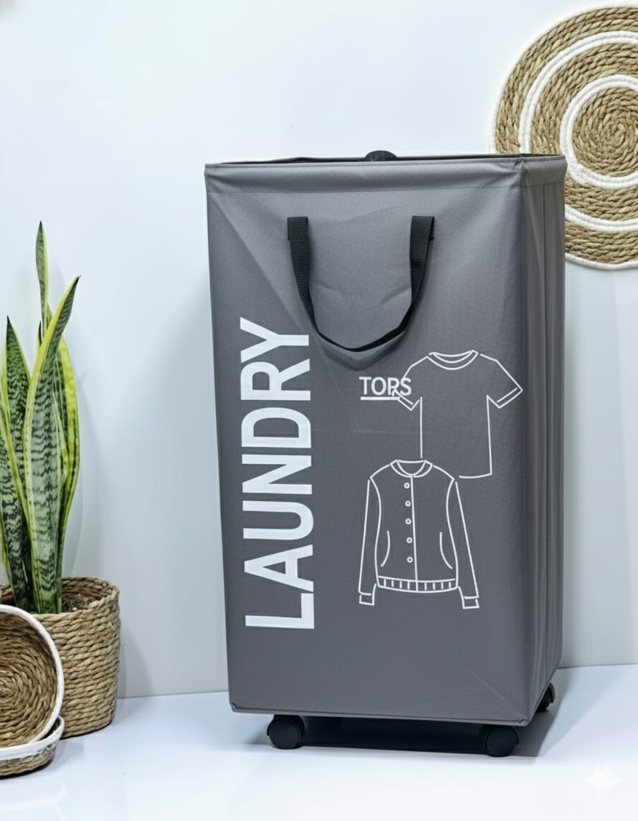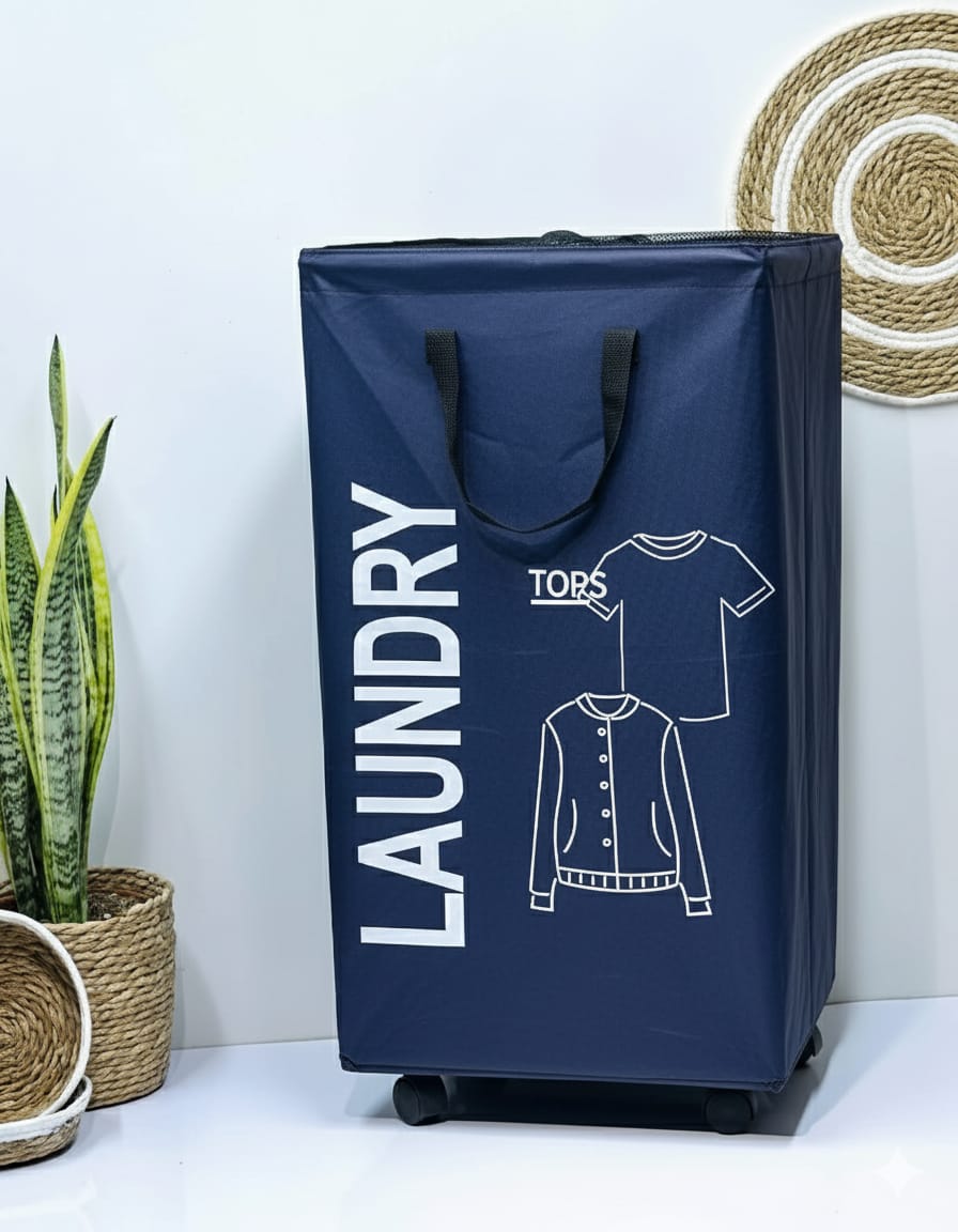 ✅ يوجد عليها طباعة بيضاء لكلمة “LAUNDRY” (غسيل) عمودياً على جانب واحد، ورسومات توضيحية لقطعتين من الملابس (تي شيرت وسترة) على الجانب الآخر.