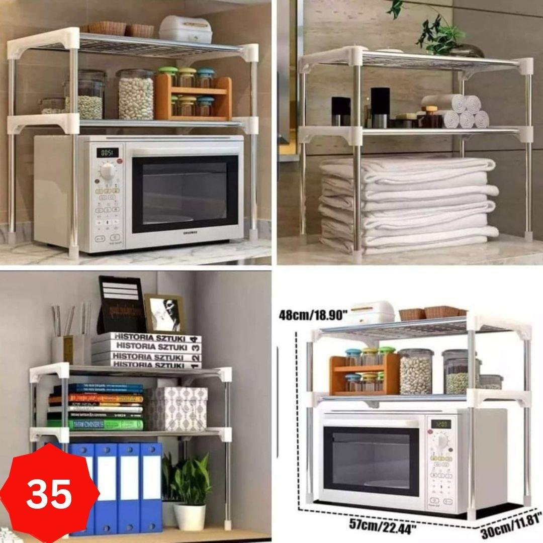ستاند للمايكرويف بشكل عصري ومتعدد الاستخدام مصنوع من المعدن يحتوي على رفين ( رف لوضع المايكرويف واخر لترتيب الاراض اللازمة للمطبخ ) يمكن استخدامه لترتيب مستلزمات المطبخ يحتوي على علاقات جانبية