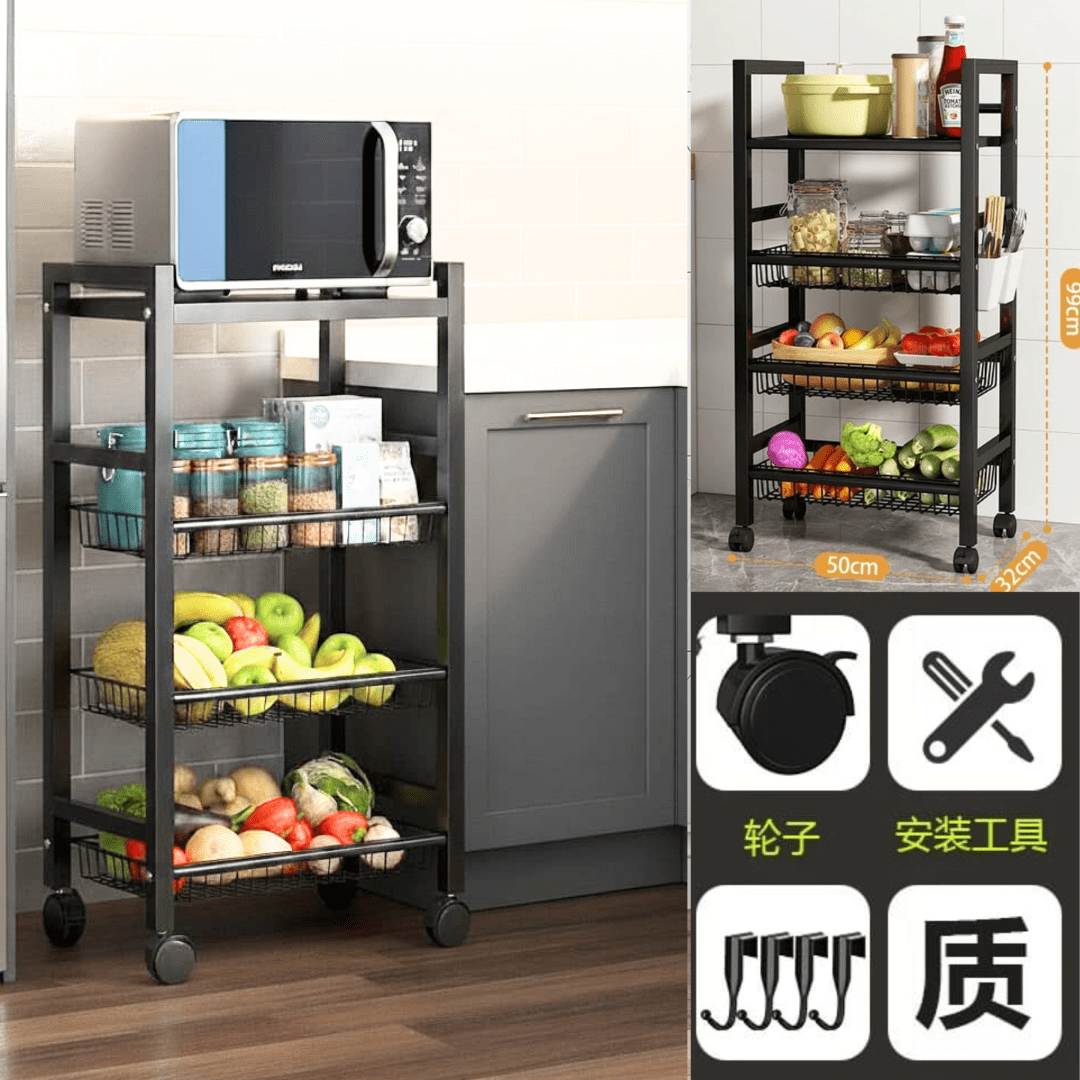 ✅ تصميم من أربع طبقات، ثلاث سلال شبكية ورف واحد، عجلات لسهولة الحركة، وقدرة تحمل قوية.