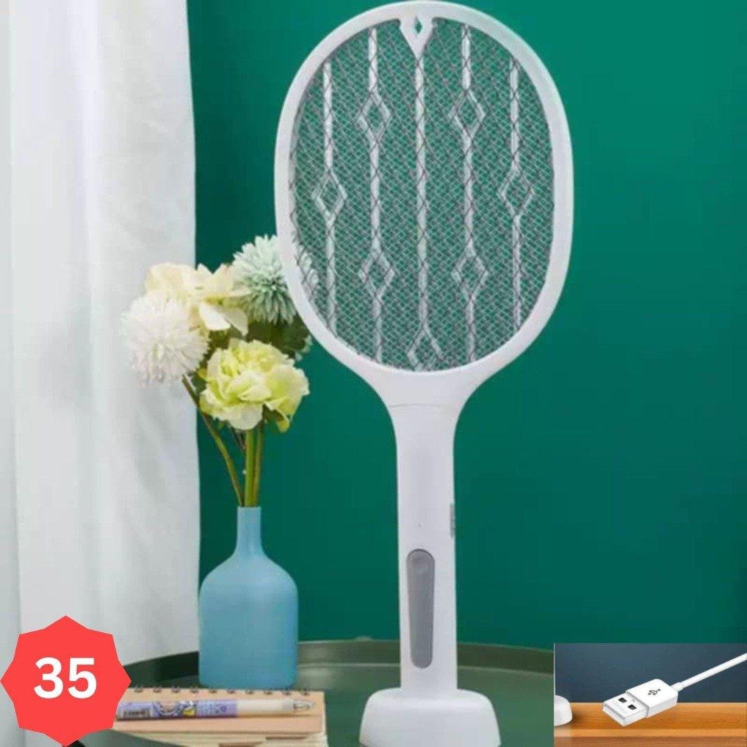✅ يأتي بتصميم مضرب تنس، وهو أبيض اللون، ويحتوي على شبكة داخلية معدنية محاطة بشبكة حماية خارجية .
